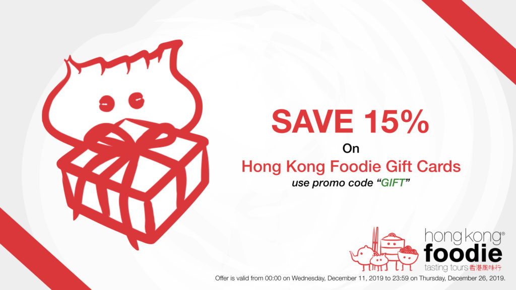 1. 15% discount is only valid for Foodie Gift Cards purchased on our website at www.hongkongfoodietours.com from 00:00 HKT on Wednesday, December 11th, 2019 until 23:59 HKT on Thursday, December 26th, 2019.